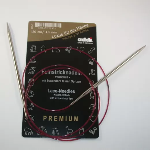The nickel-free Addi Lace Circular Needles have more tapered tips than the Addi Basic (Turbo) Circular Needles, which makes sliding into the tightest or most intricate stitches a breeze, thus making them especially suitable for lace knitting. They have the same handling qualities as the Addi Basic (Turbo) Circular Needles.