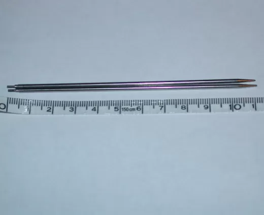 HiyaHiya Sharp knitting needles are high quality steel needles. They feature a very sharp and pointy tip, and the transition between tips and cable (when connected) is barely noticeable. These needle tips are approx. 12,5 cm (5") long.